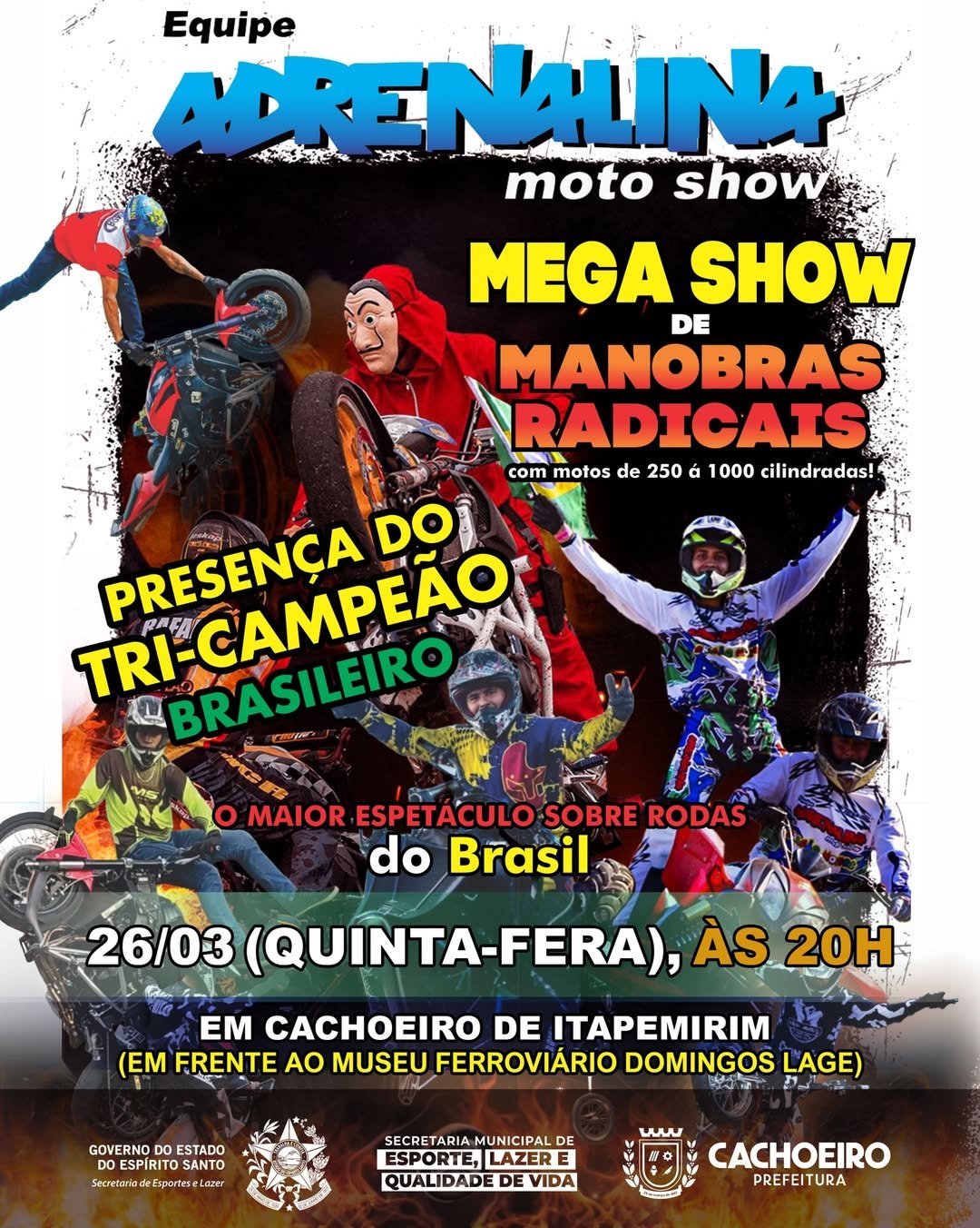 Prepare-se para uma noite eletrizante em Cachoeiro de Itapemirim! A cidade recebe o incrível Adrenalina Moto Show, um espetáculo que promete tirar o fôlego do público com manobras radicais e muita emoção sobre duas rodas.